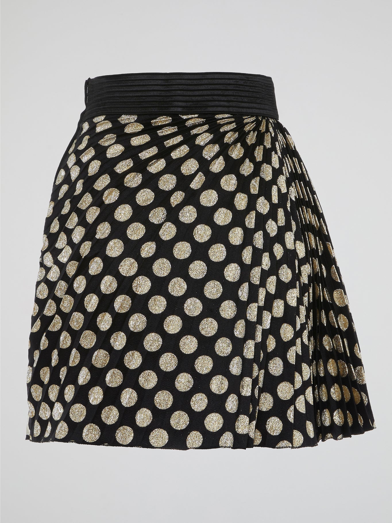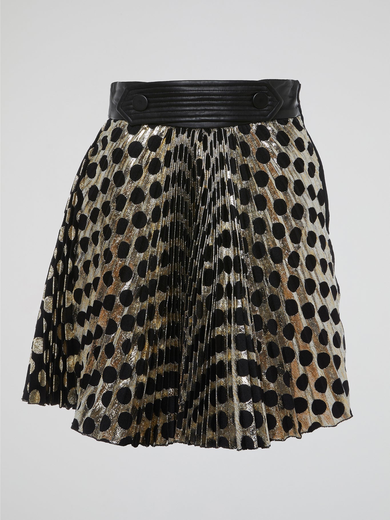 Turn up the charm with the Emanuel Ungaro Foil Polka Dot Pleated Skirt! Designed to make heads turn, this playful skirt features shimmering foil polka dots that bring a touch of whimsy to any outfit. Its flattering pleated design adds movement and dimension, while the high-quality craftsmanship ensures a luxurious feel that will make you the center of attention wherever you go.