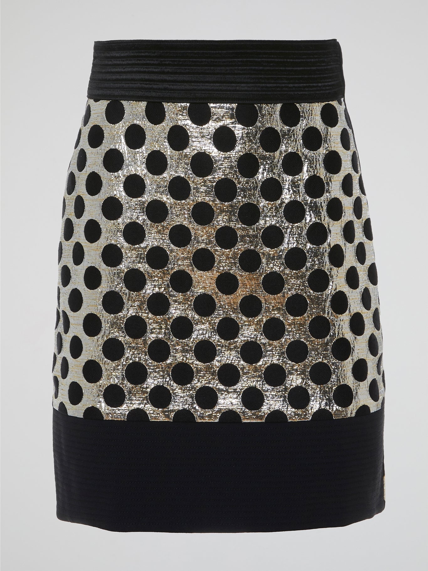 Introducing the Foil Panel Polka Dot Skirt by Emanuel Ungaro, a captivating blend of sophistication and playfulness. This cutting-edge skirt features exquisite foil panel accents that add a touch of glamour to the classic polka dot pattern, creating a truly unique and eye-catching design. Whether paired with a crisp blouse for a chic work ensemble or dressed up with a statement top for a night out, this skirt guarantees to turn heads and make a memorable fashion statement.