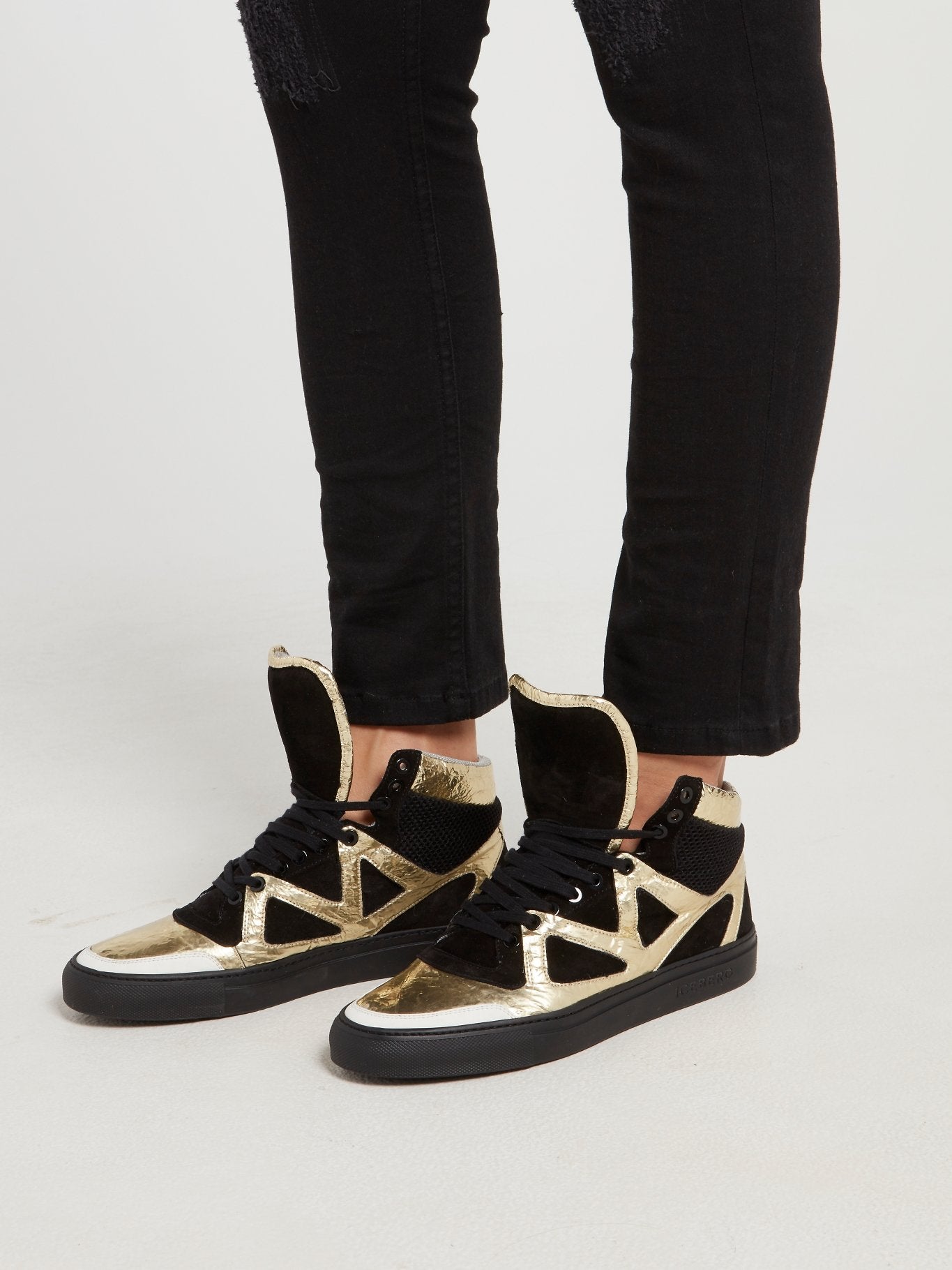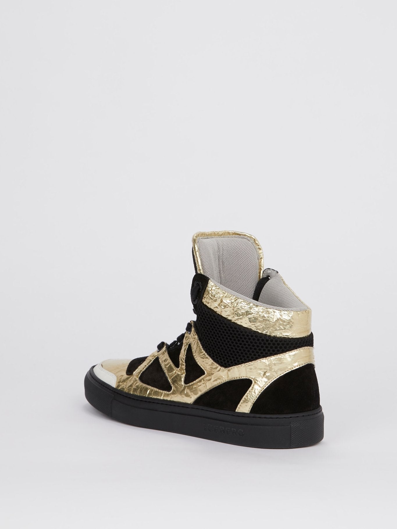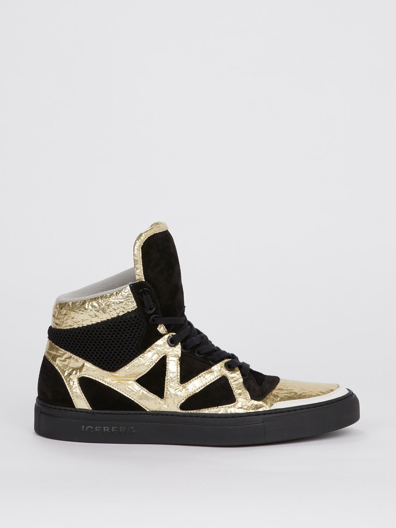 The Gold Foil Panel High Top Sneakers from Iceberg are the perfect blend of style and comfort. The metallic gold panels add a touch of glamour to any outfit and elevate your look to the next level. Perfect for dressing up or down, these sneakers are a must-have for any fashion-forward individual.