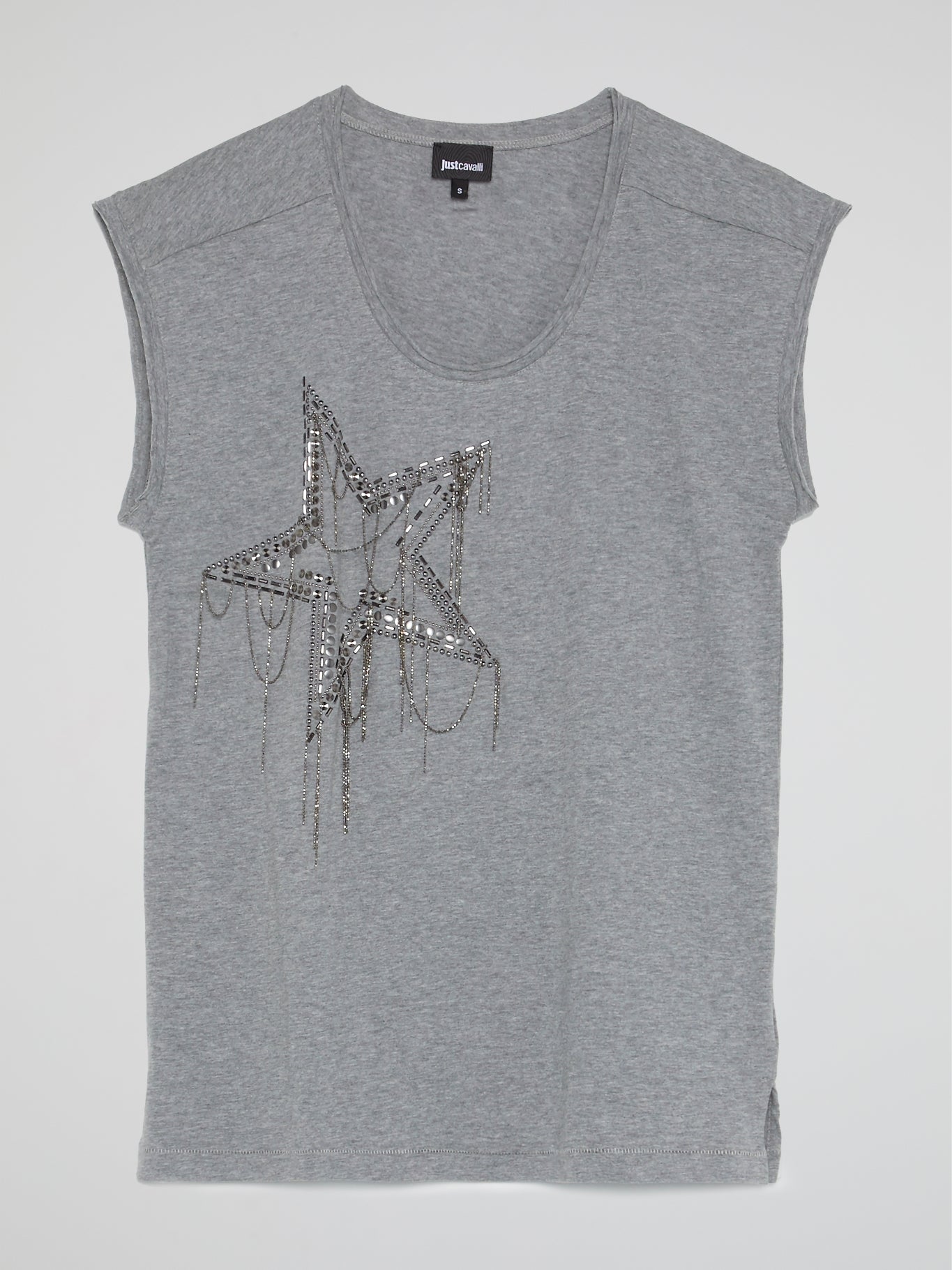 Get ready to shine bright like a star with the stunning Grey Beaded Star Sleeveless Top brought to you by Just Cavalli. This stylish top features delicately crafted beaded stars that sparkle and shimmer in the light, adding a touch of glamour to any outfit. Made from high-quality materials, this top is both comfortable and stylish, making it the perfect addition to your wardrobe for any special occasion.