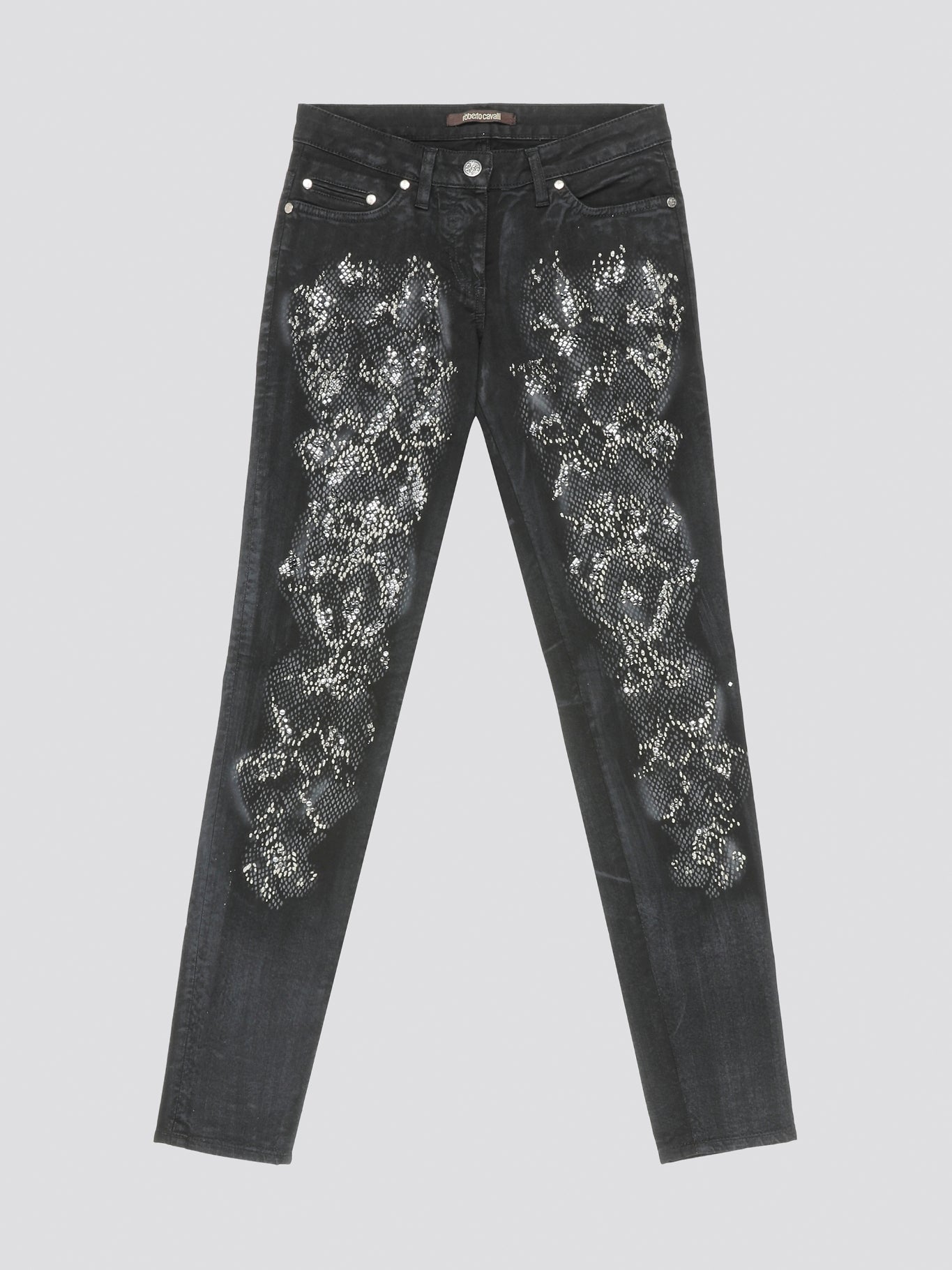 Step into the spotlight with these Grey Crystal Embellished Jeans by Roberto Cavalli, where luxury meets edgy sophistication. The intricate crystal detailing adds a touch of glamour to your everyday denim, ensuring you stand out from the crowd. Elevate your street style and add a touch of sparkle to your wardrobe with these statement jeans.