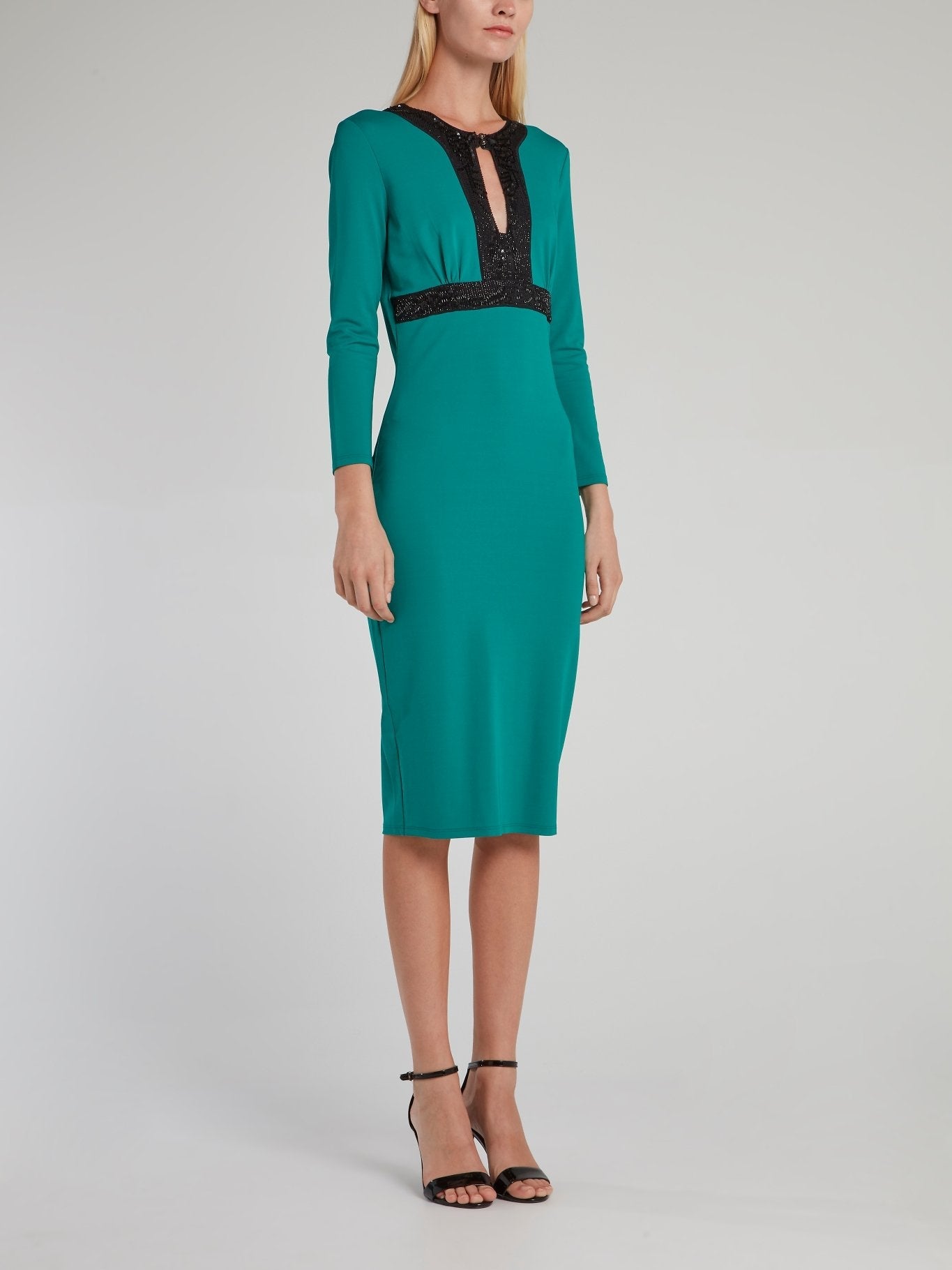 Shimmer and shine in this radiant Green Sequin Detail Keyhole Dress by Roberto Cavalli. The alluring keyhole neckline and elegant silhouette create a captivating look that's perfect for any occasion. The dazzling sequin detailing adds a touch of glamour, making it the perfect dress to stand out in a crowd.