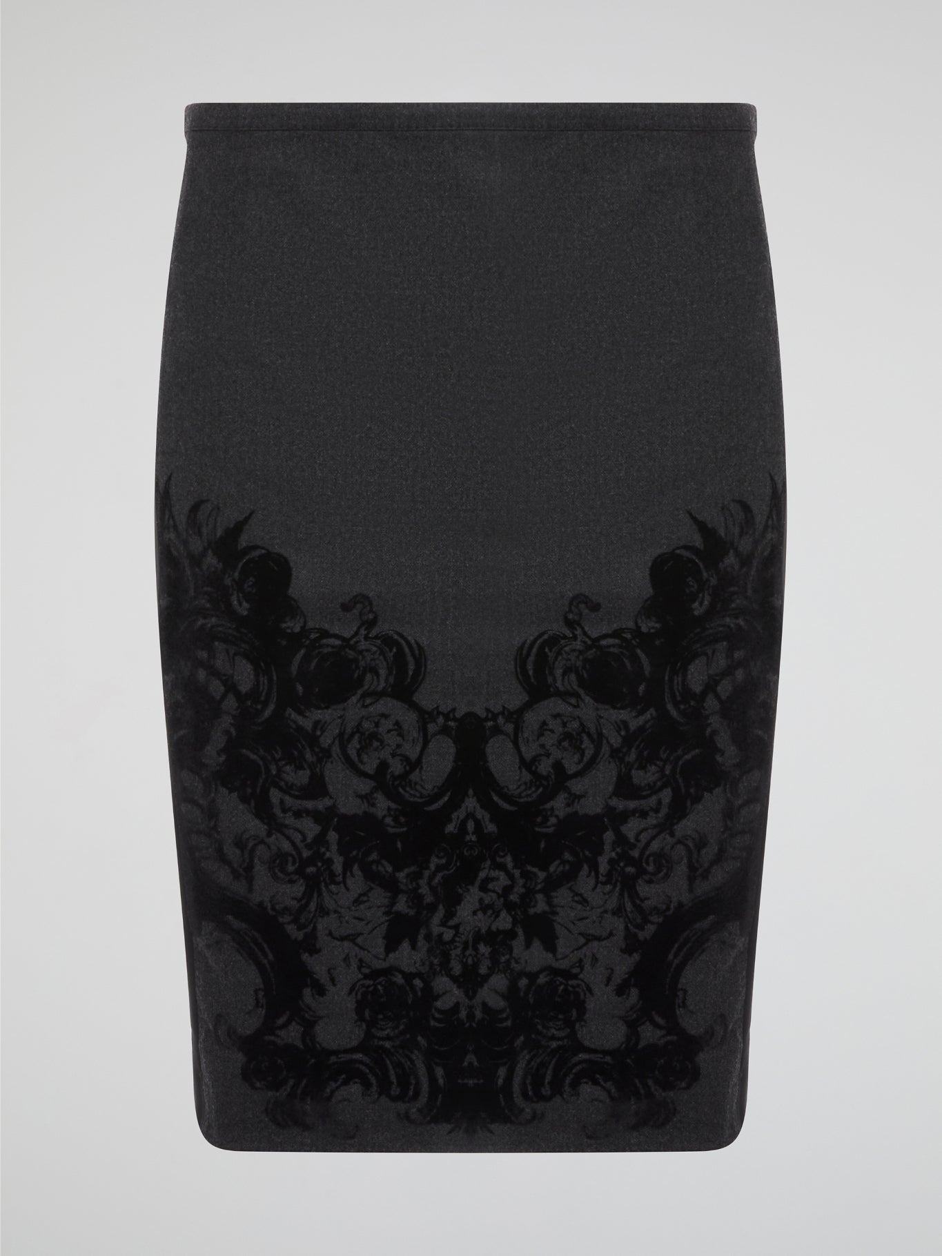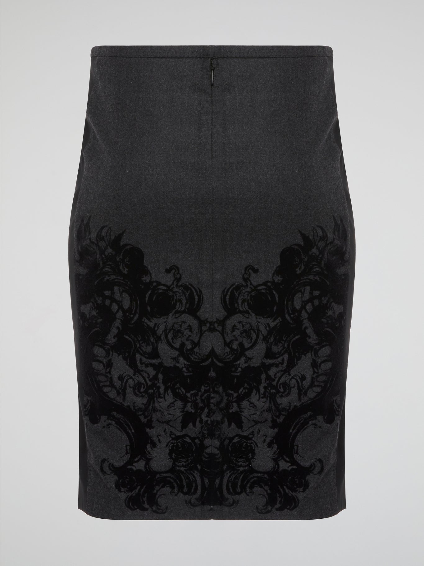 Elevate your office attire with this stunning grey printed pencil skirt from iconic designer Roberto Cavalli. The intricate pattern adds a touch of sophistication and style, making you stand out from the crowd. Pair it with a crisp white blouse and heels for a polished and fashion-forward look that will turn heads wherever you go.