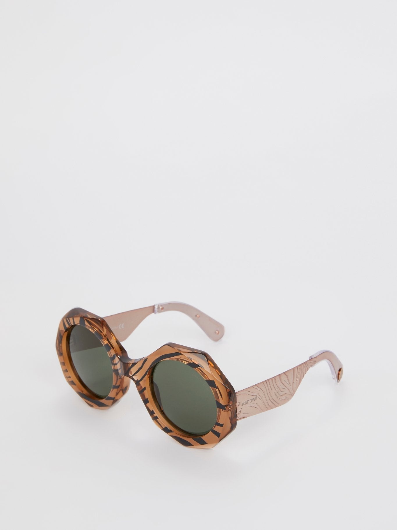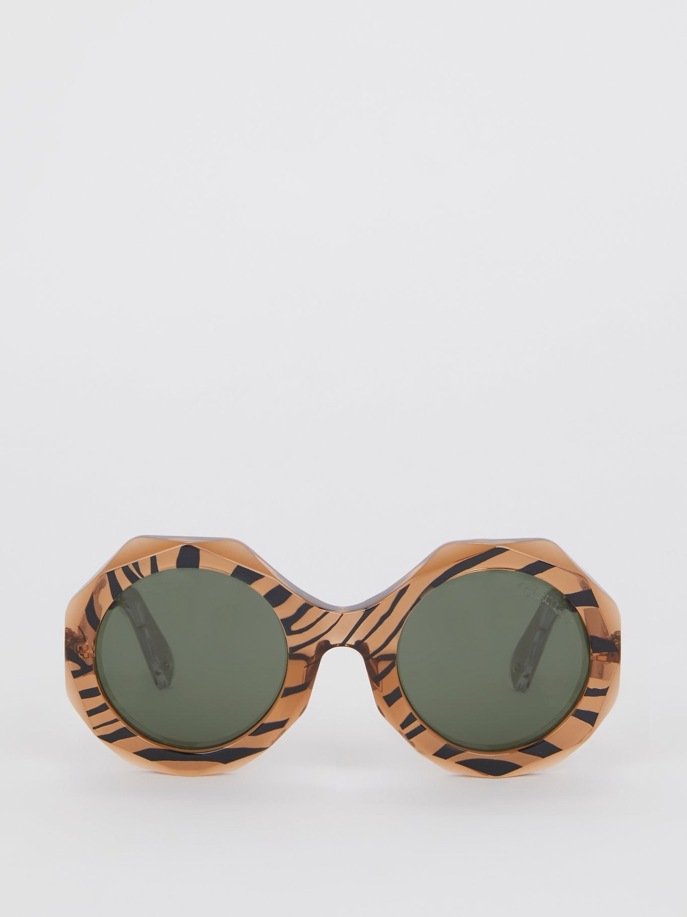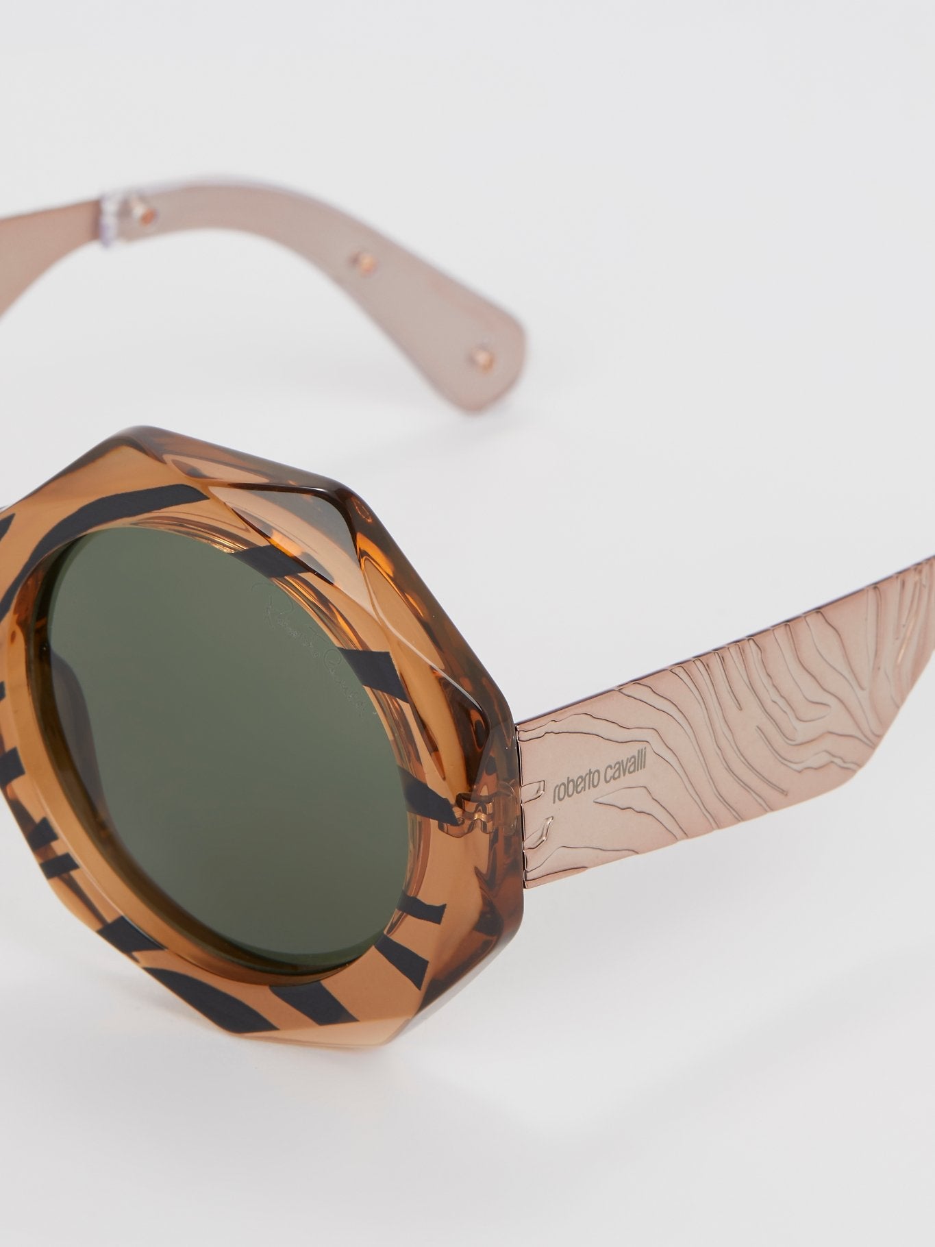 Unleash your inner animal with these bold and striking geometric tiger print sunglasses by Roberto Cavalli. Featuring a unique geometric design and statement tiger print, these shades are sure to turn heads and set you apart from the crowd. With premium materials and superior craftsmanship, these sunglasses are as stylish as they are practical, providing both protection and panache for all of your sunny day adventures.