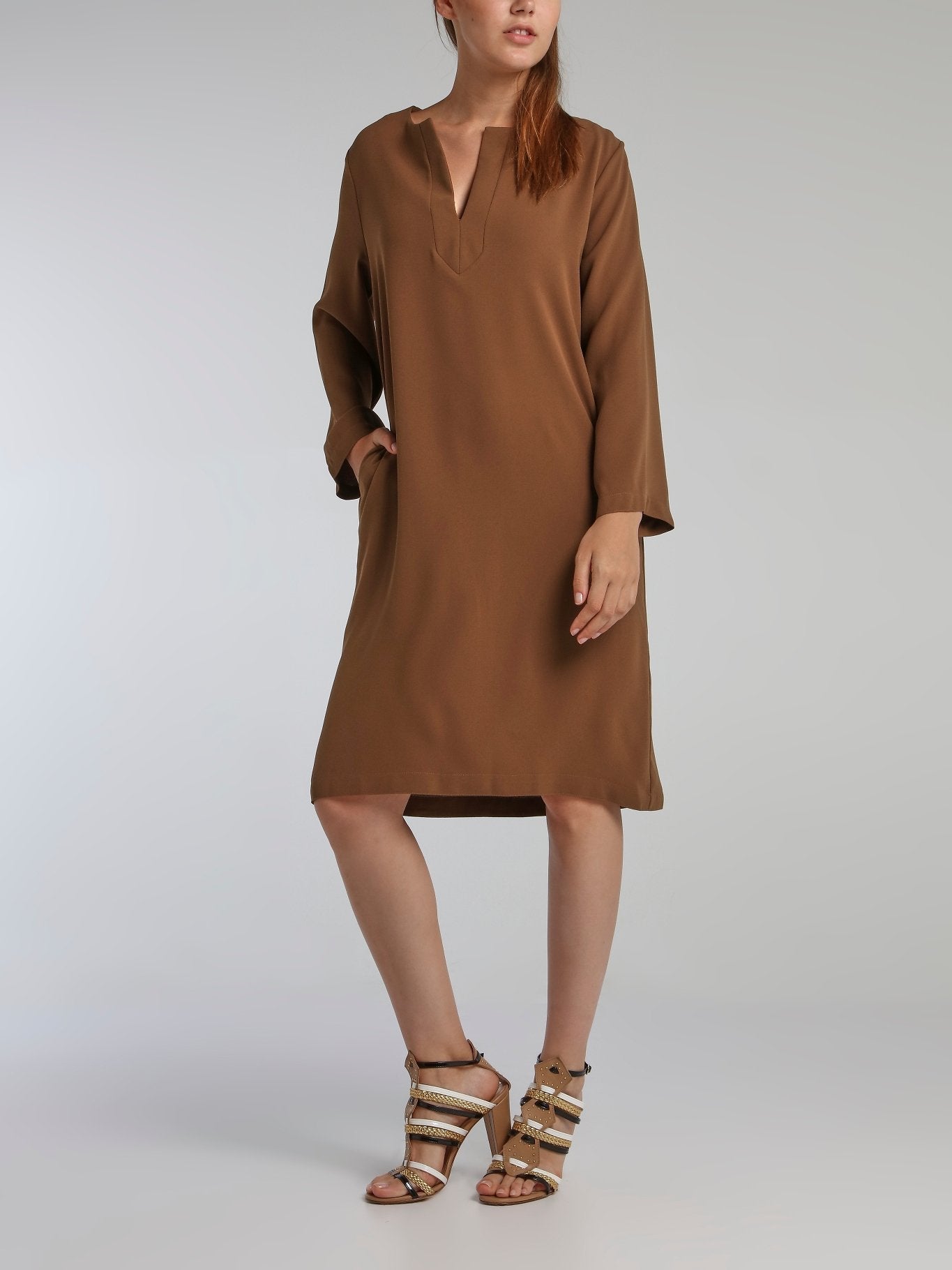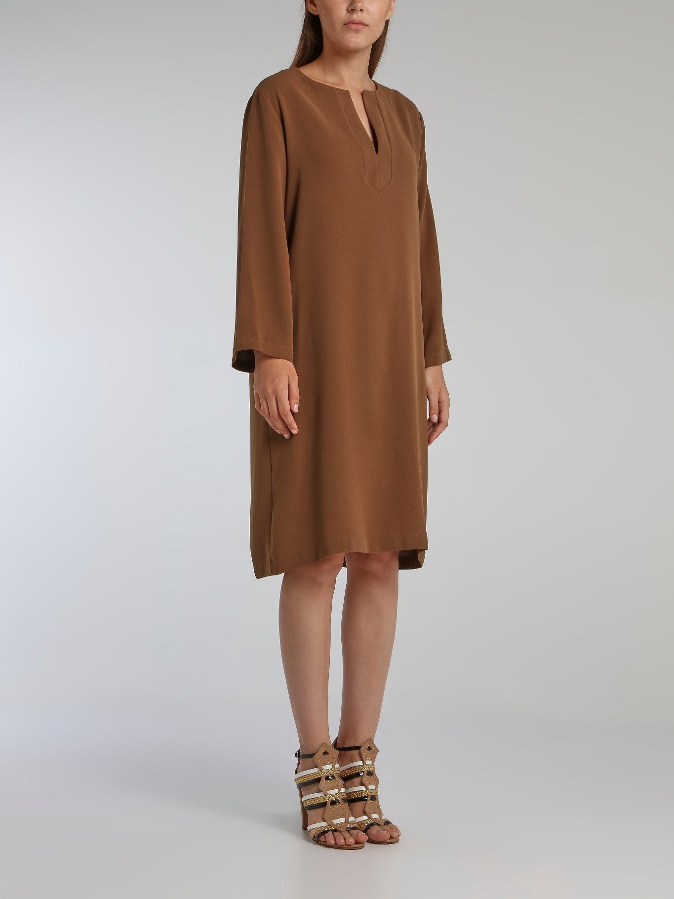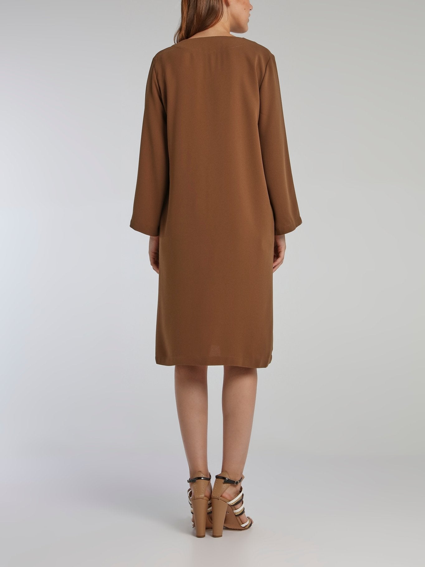 Line Brown Long Sleeve Crepe Dress