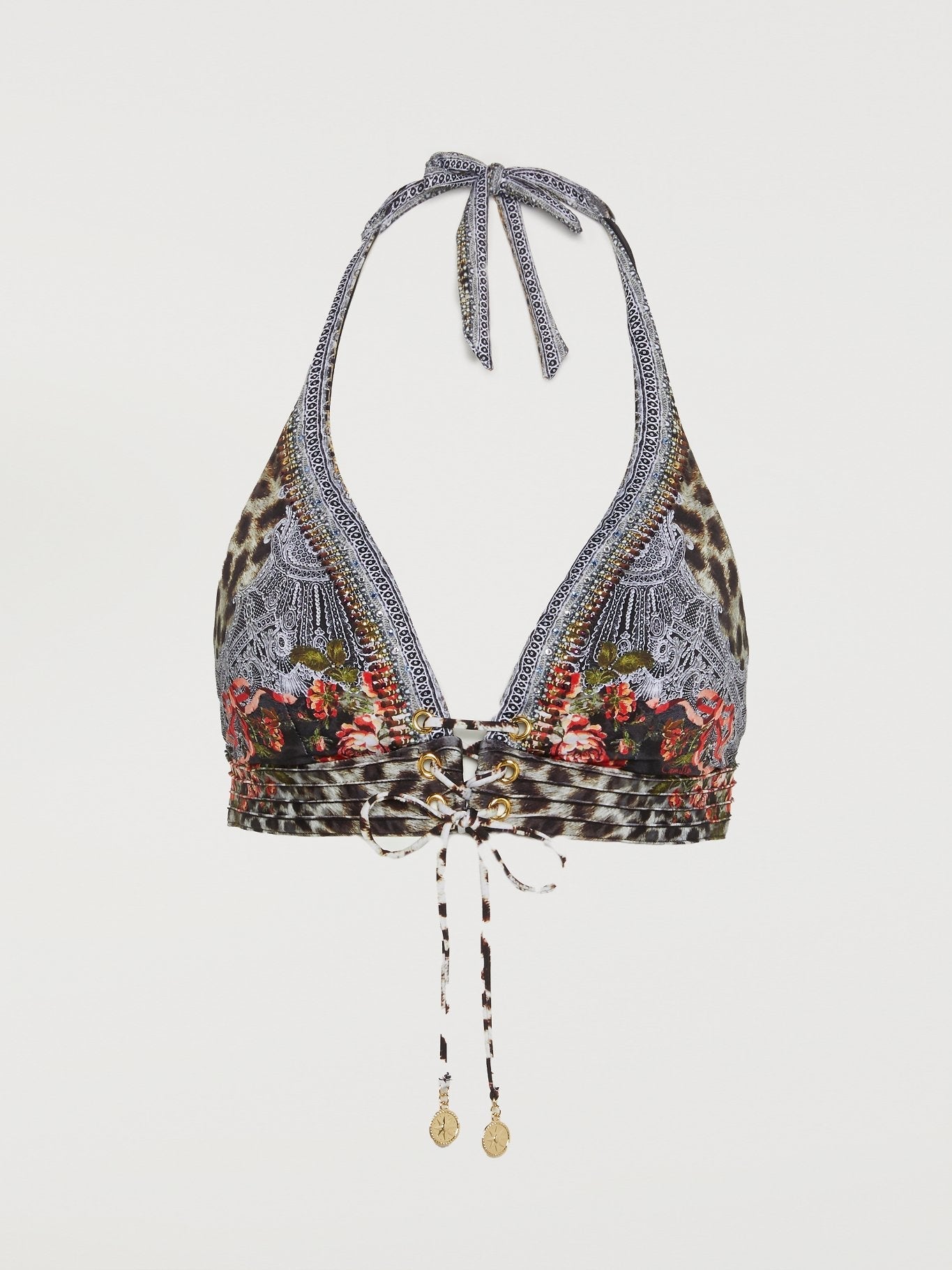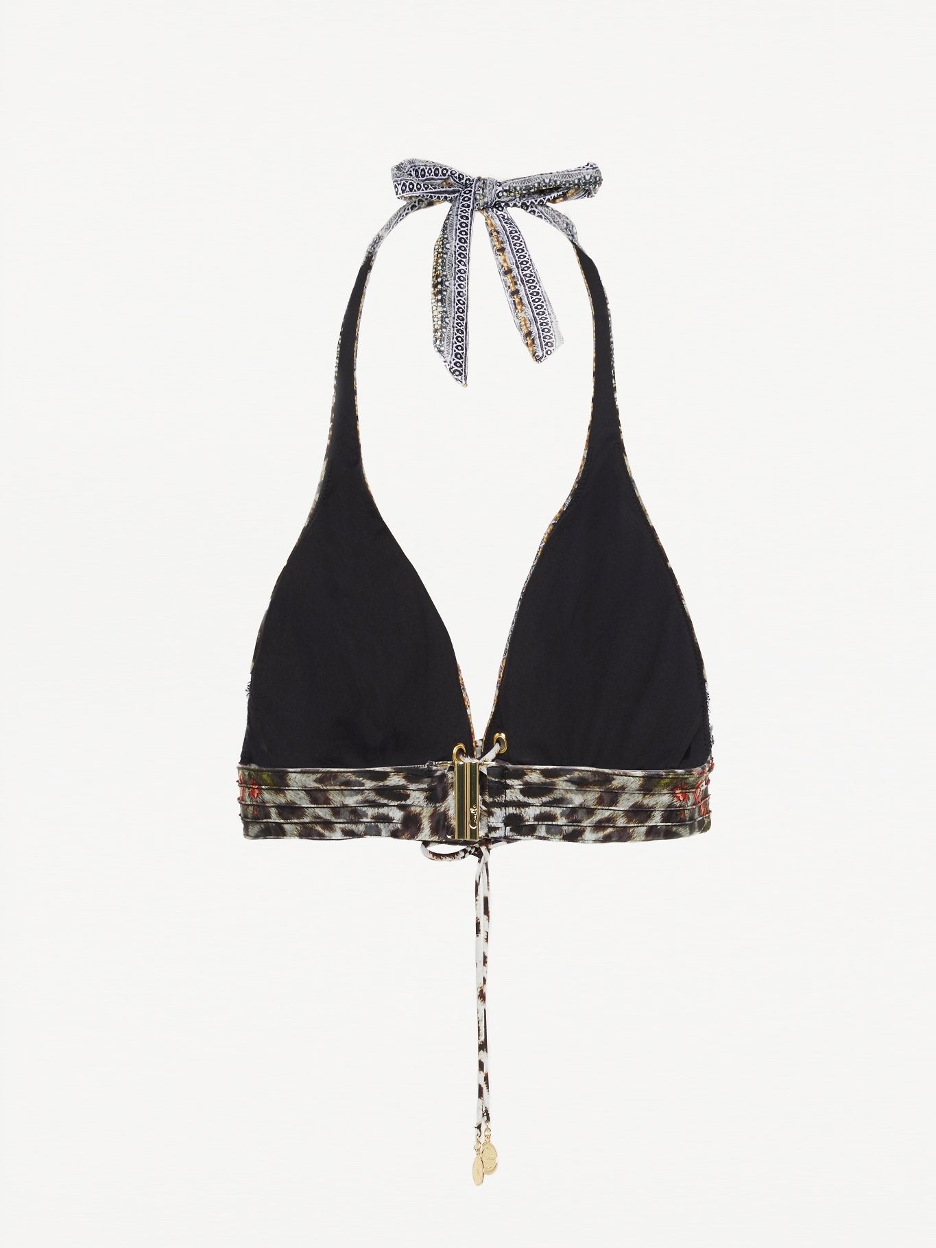 Indulge in the wild side with our Leopard Panel Halter Bikini Top from Camilla. This trendy and chic top comes in a flattering style that feels comfortable while enhancing your natural curves. Whether you're lounging by the pool or hitting the waves, this bikini top is a perfect pick to make a statement without compromising on style.