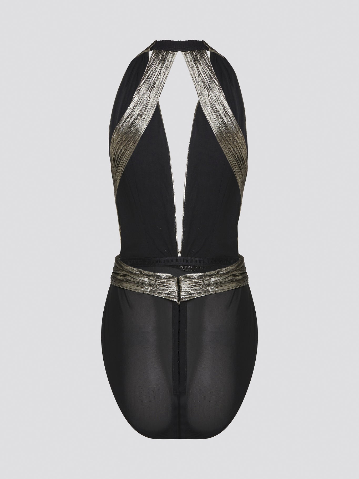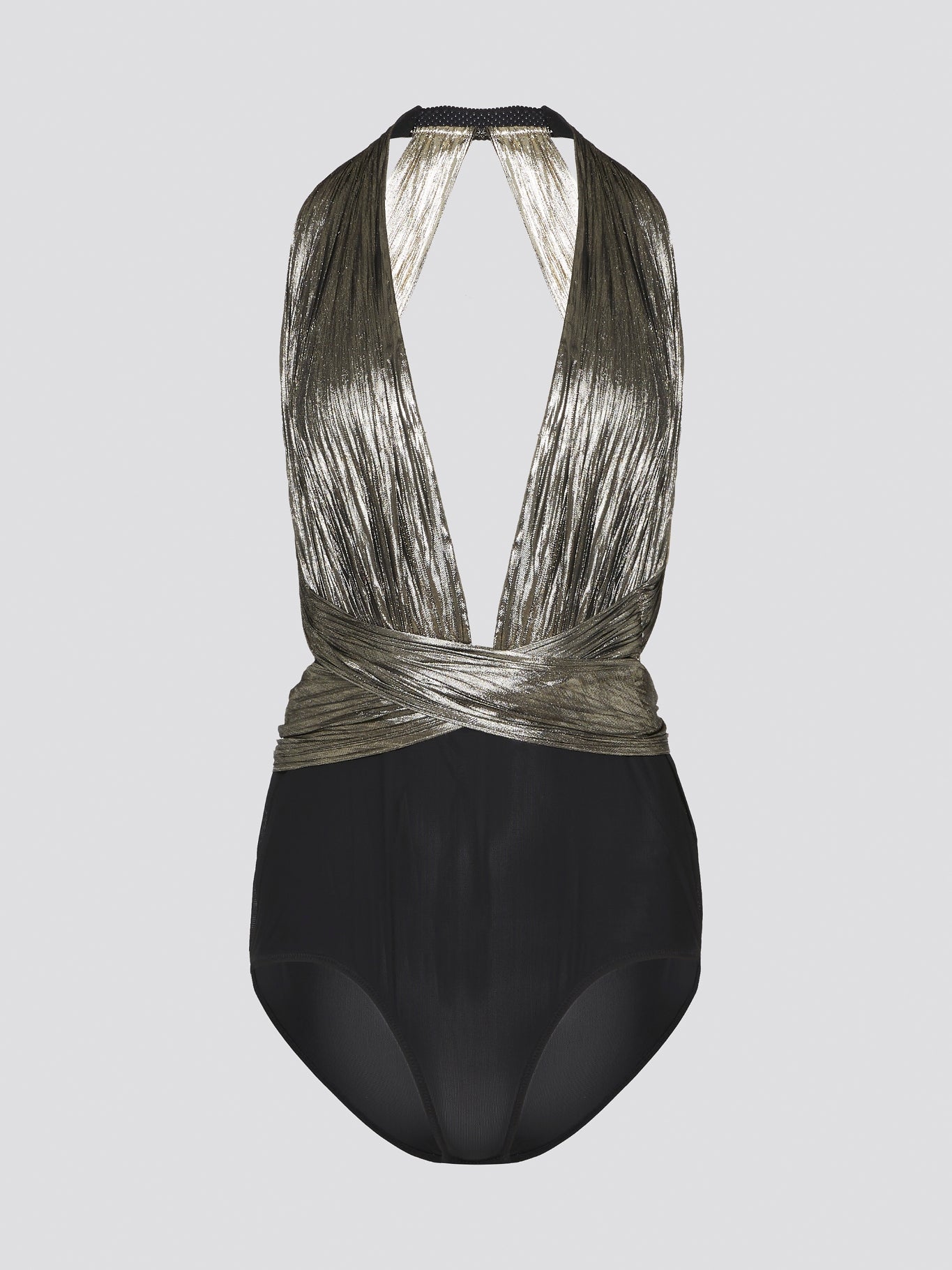 Shimmer like a star in the night sky with the Metallic Bodysuit by Maria Lucia Hohan. This show-stopping piece features a luxurious metallic fabric that hugs your curves in all the right places, while the plunging neckline adds a touch of glamour and allure. Perfect for a night out on the town or a special occasion, this bodysuit will have all eyes on you.