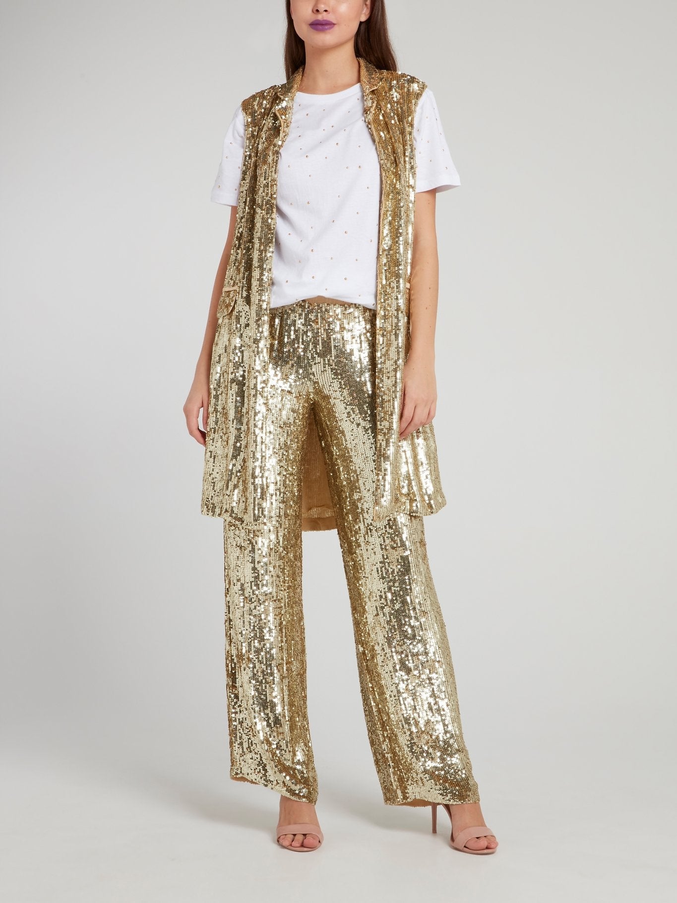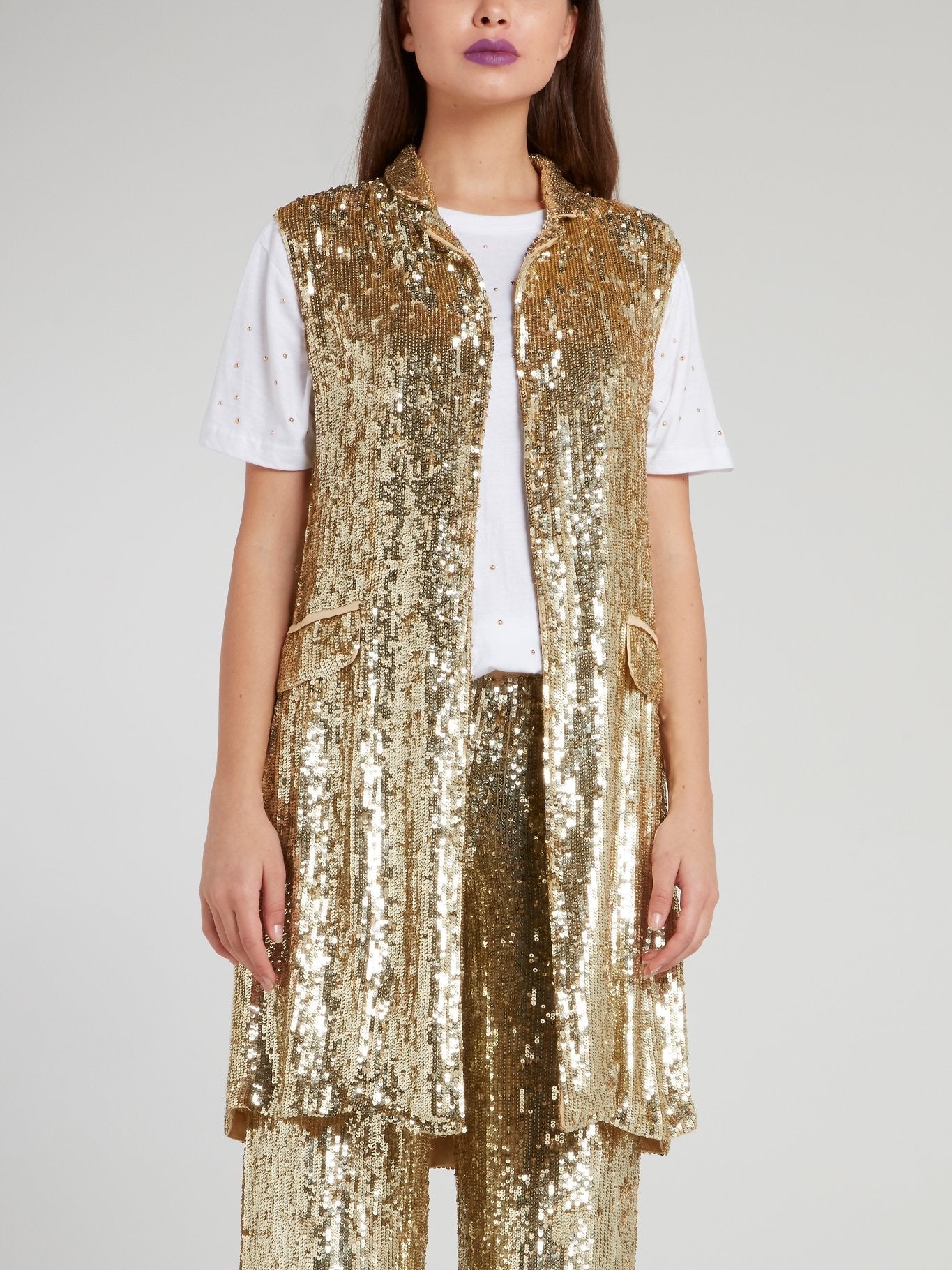 Introducing the Gold Sequin Long Gilet from the luxurious brand Parosh! This dazzling piece is perfect for adding some sparkle and glam to any outfit, with its eye-catching sequins and elegant long length. Whether you're dressing up for a special occasion or simply want to elevate your everyday look, this gilet is the perfect choice to make a statement and shine bright like a star!