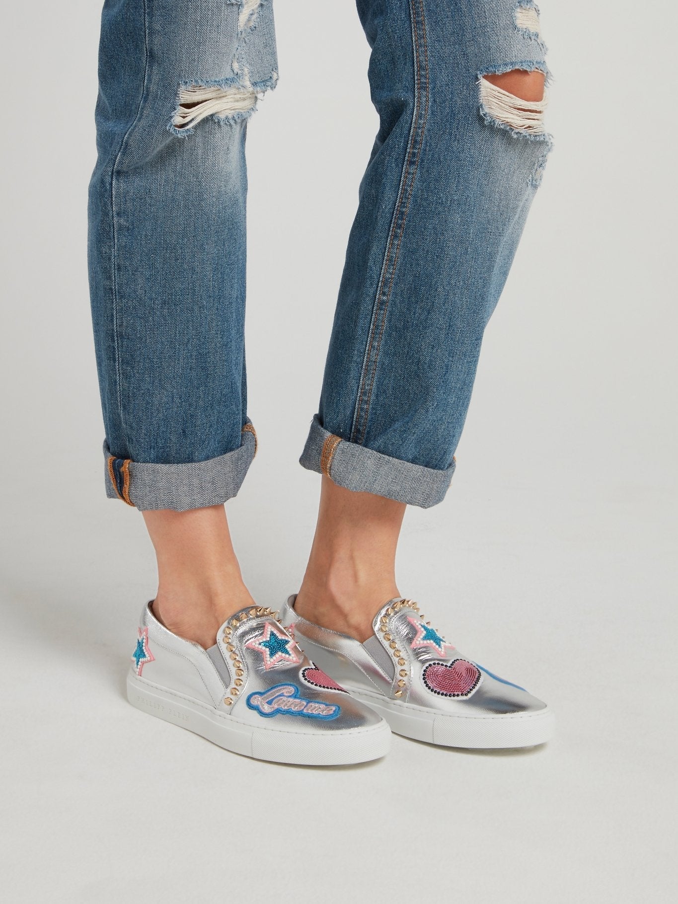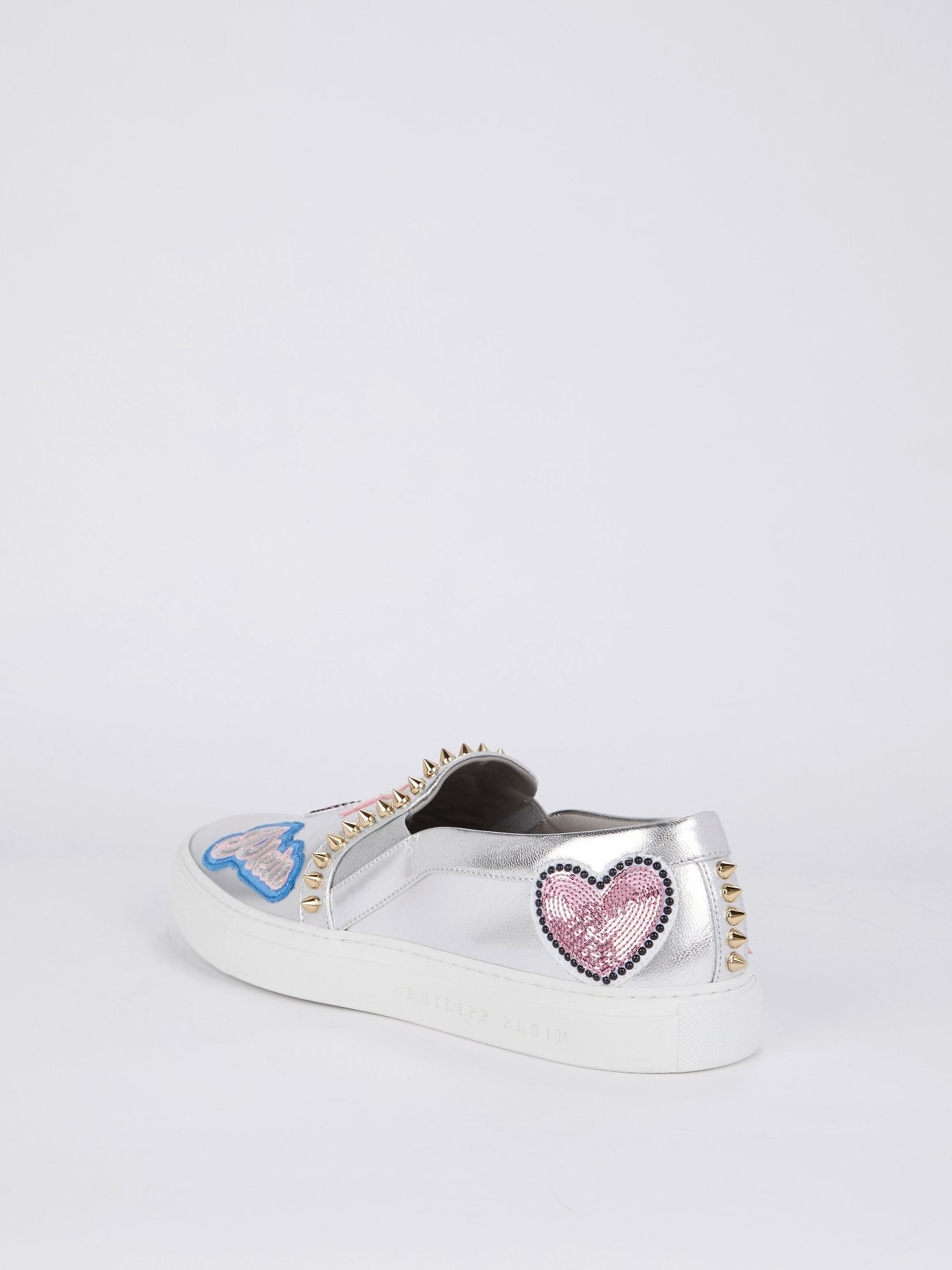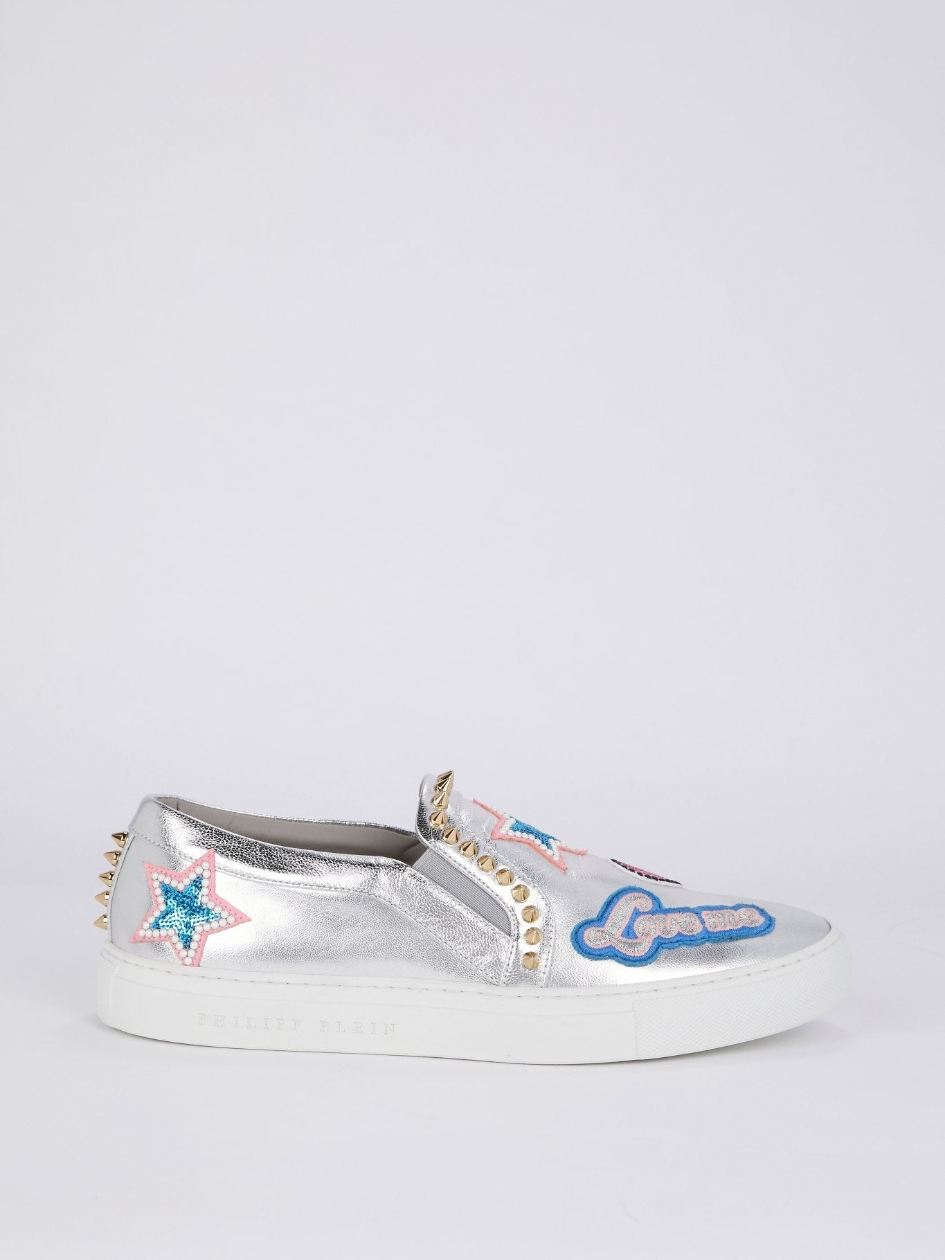 Step up your sneaker game with Philipp Plein's Metallic Appliqued Slip On Sneakers, perfect for adding an edgy touch to any outfit. These slip-on sneakers feature stunning metallic embellishments, giving you a unique and luxurious look. With their comfortable fit and stylish design, these sneakers are a must-have for any fashion-forward individual.
