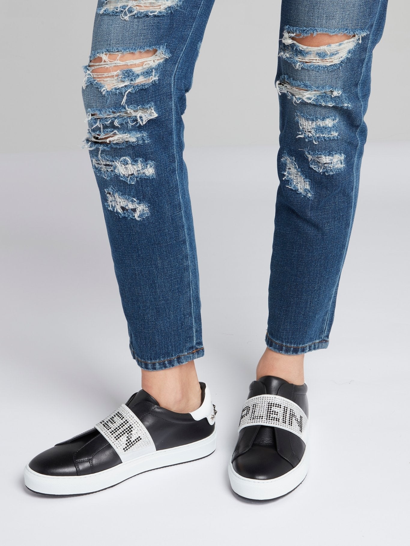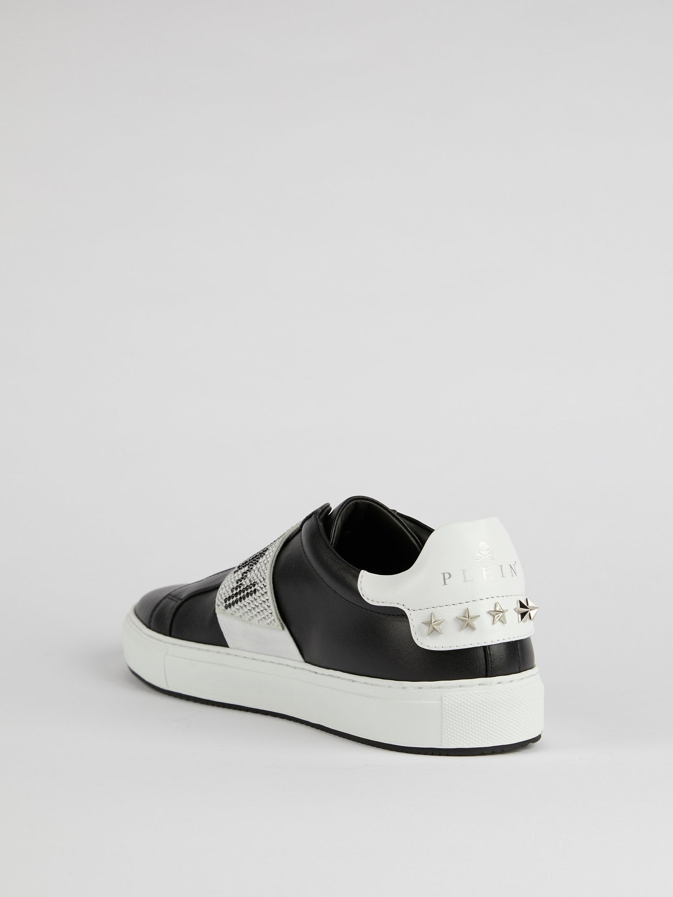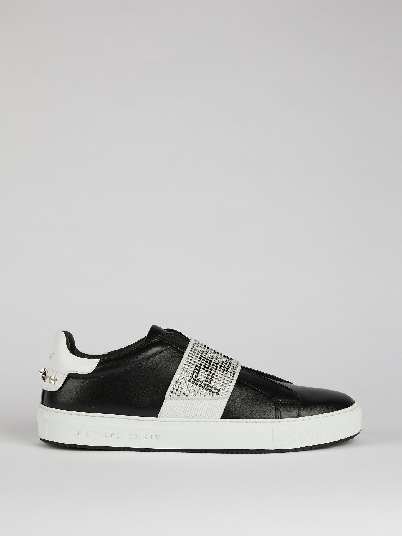 Step up your shoe game with these Naty Black Studded Logo Front Strap Sneakers by Philipp Plein. Made with premium quality materials, these sneakers feature a stylish studded design and a front strap with the brand's iconic logo. With a versatile black color, these sneakers can easily be paired with any outfit for a perfect blend of comfort and style.