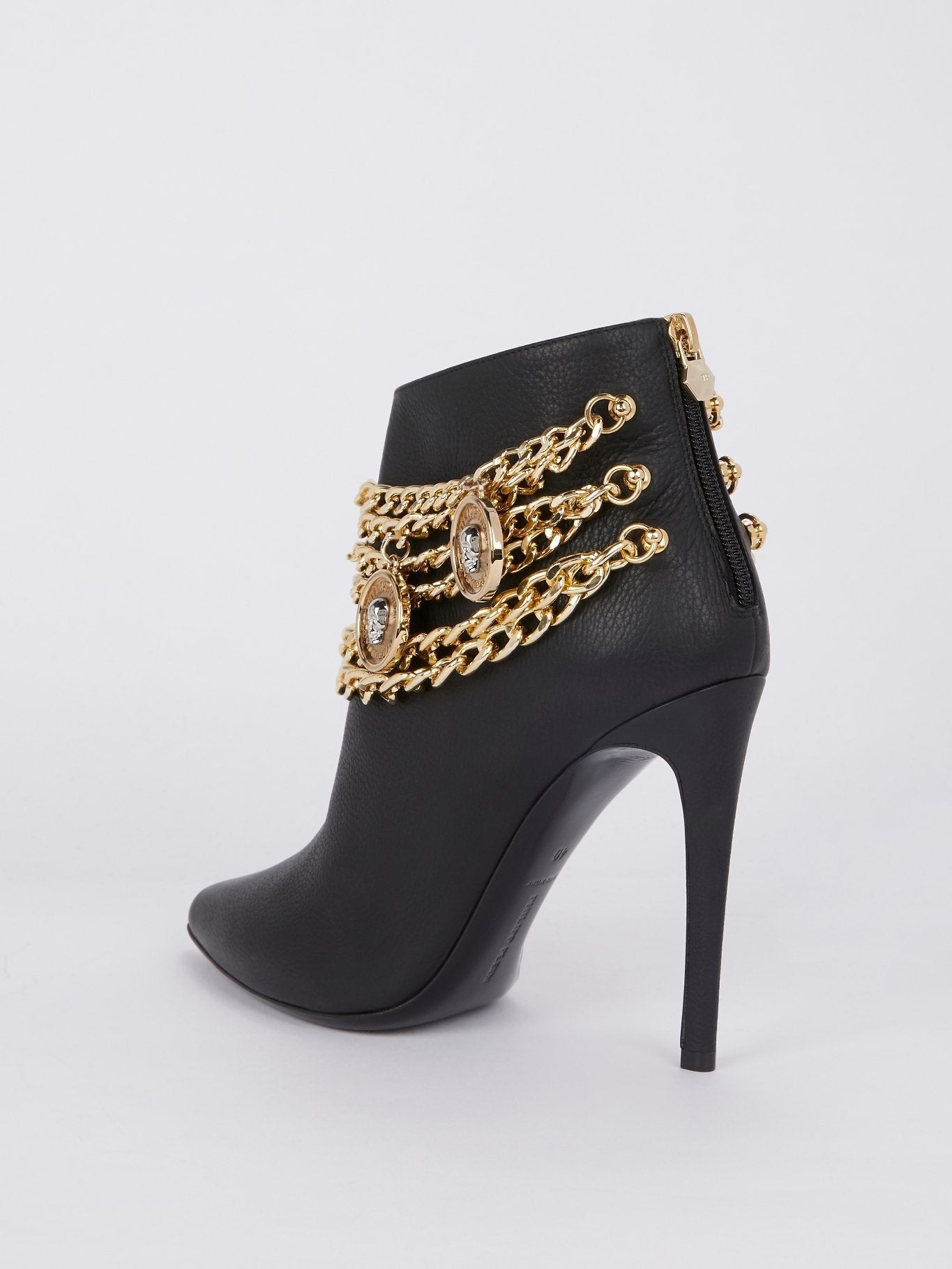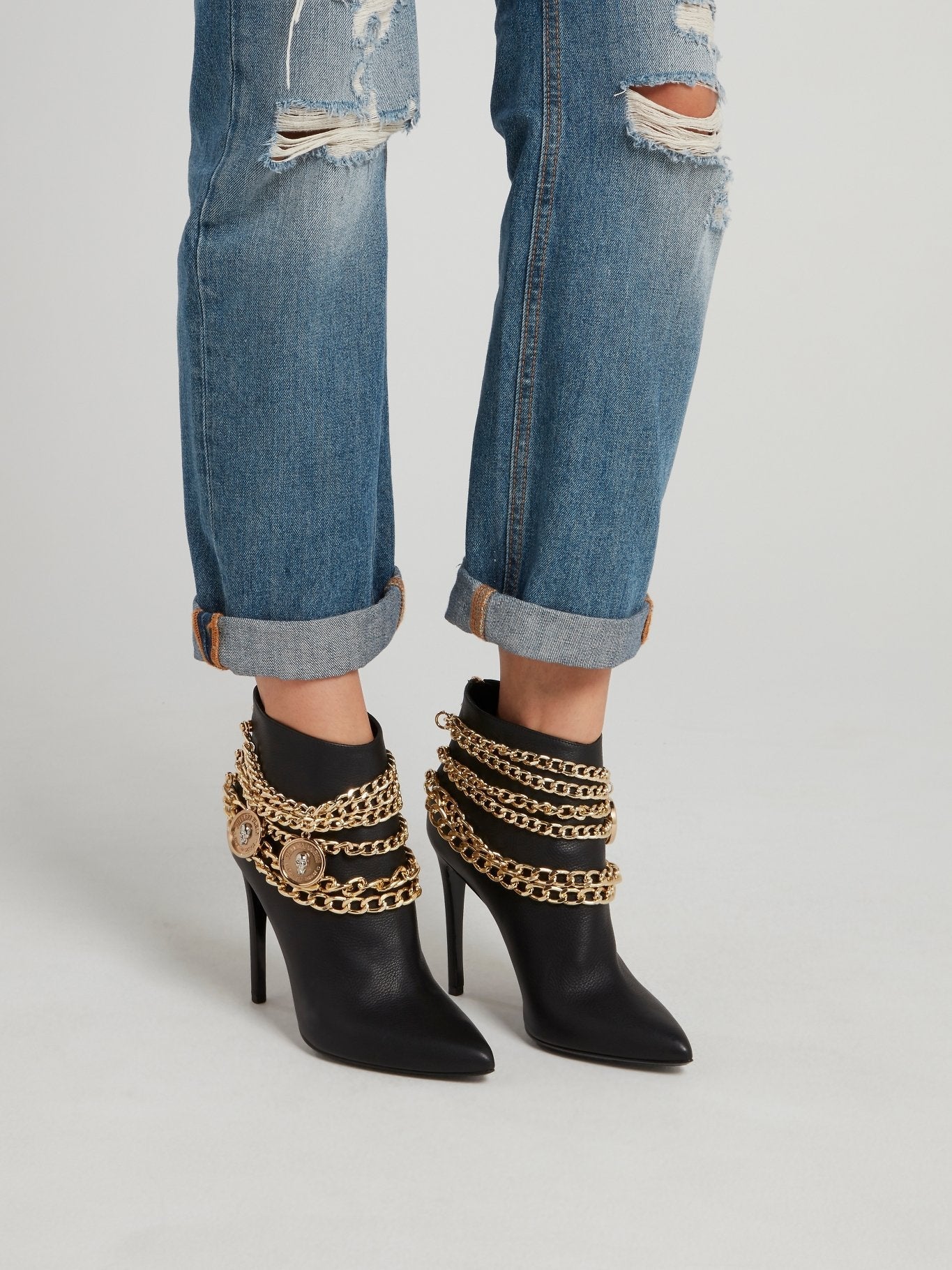Add a touch of glamour to your footwear collection with the Gold Chain Embellished Ankle Boots from iconic designer Philipp Plein. These standout boots feature a sleek black leather base, adorned with stylish gold-tone chain detailing for a bold and edgy look. Perfect to dress up or down, these ankle boots will quickly become your go-to statement piece for any occasion.