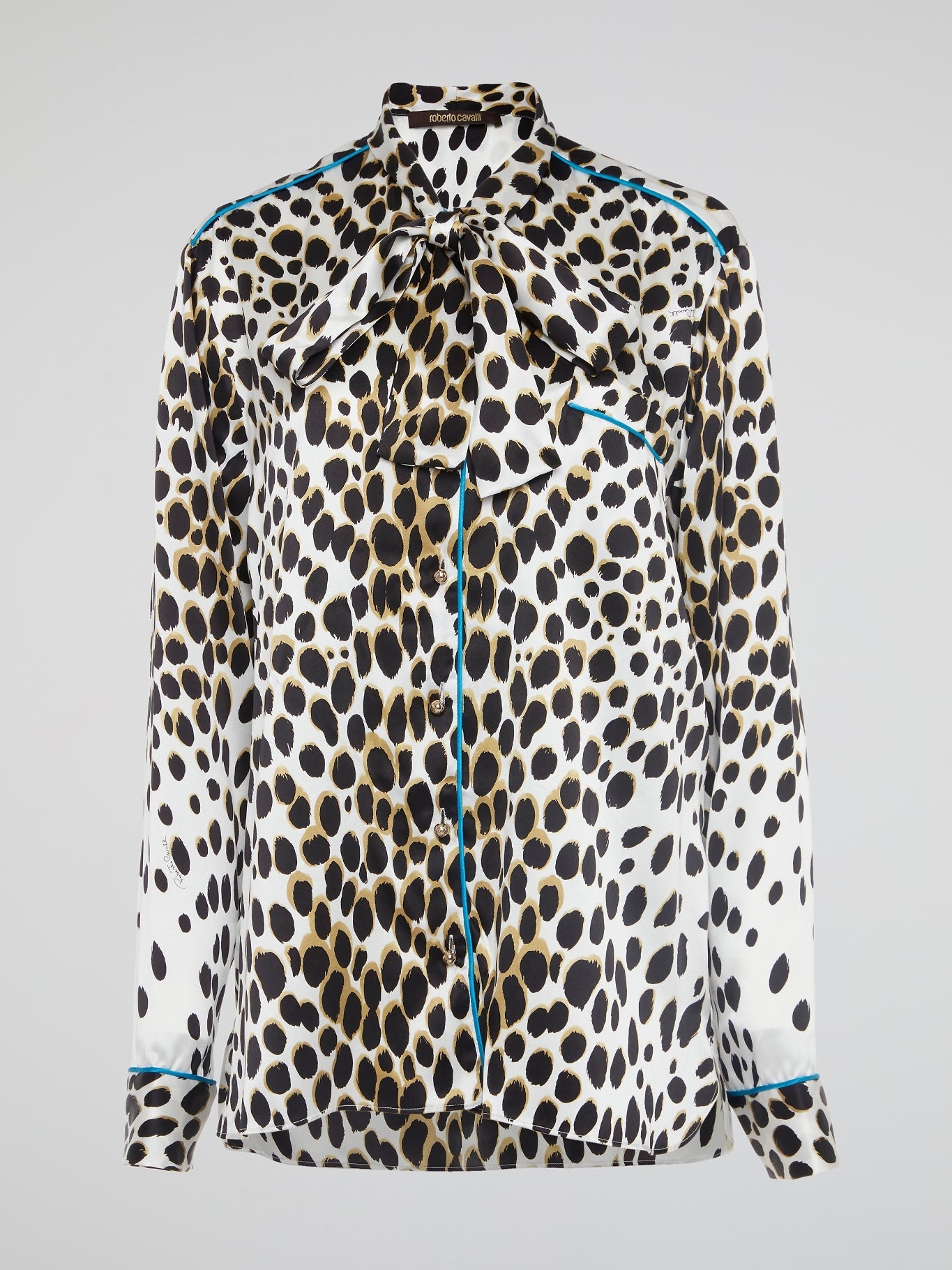 Unleash your wild side with this fierce Leopard Print Bow Tie Blouse by Roberto Cavalli. Embrace your inner fashionista with this bold statement piece that is sure to turn heads wherever you go. Add a touch of glamour and sophistication to your wardrobe with this unique and trendy top that exudes confidence and style.
