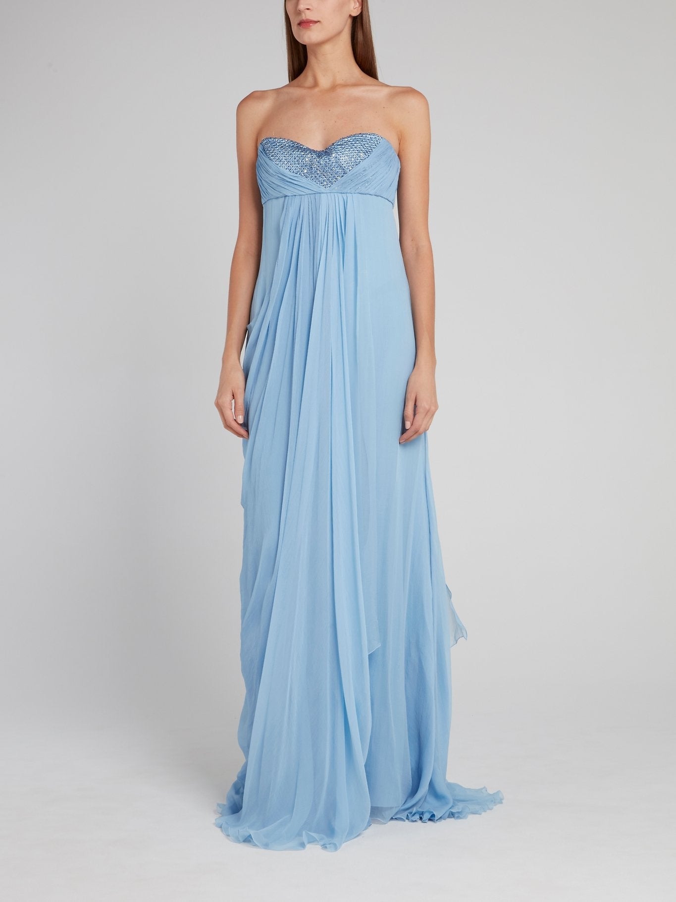 This sensationally feminine empire waist gown will be a hit on high-octane occasions. Its fluid silhouette is set under a traditional strapless sweetheart neckline that forms a canvas for dramatic jewellery, while the fabric skims the figure to an exquisite maxi length, evoking the splendour of vintage evening wear. Make the most of the design's sartorial perfection by harmonizing it with similarly eye-catching accessories.