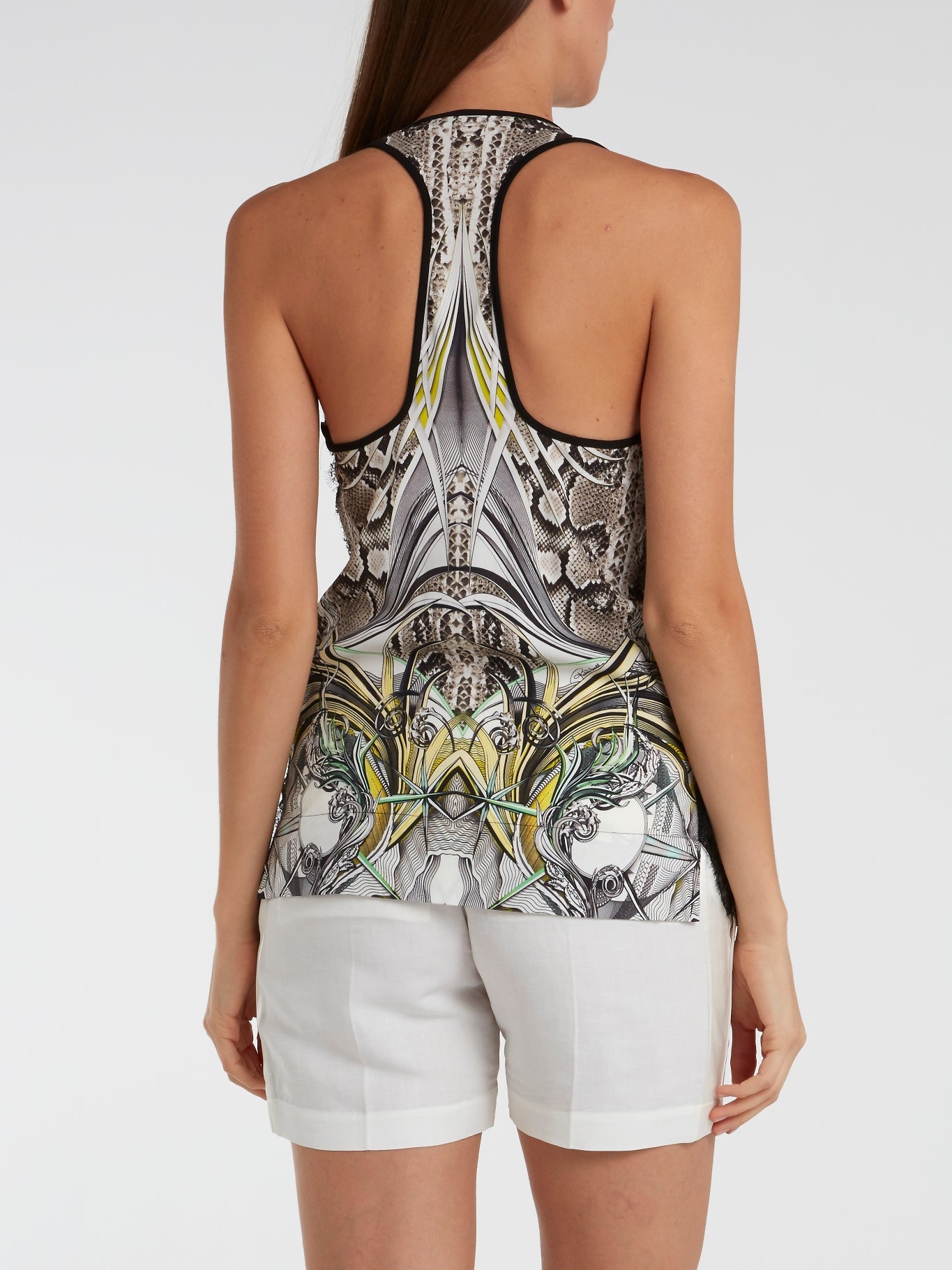 Look flawless and feminine in this Roberto Cavalli Lace Hem Racerback Tank Top. The intricate lace detailing on the hemline adds a touch of elegance and timeless charm to this classic racerback tank top. Perfect for a day out with friends or a night out on the town, this top is sure to turn heads and make you feel like a stylish goddess.