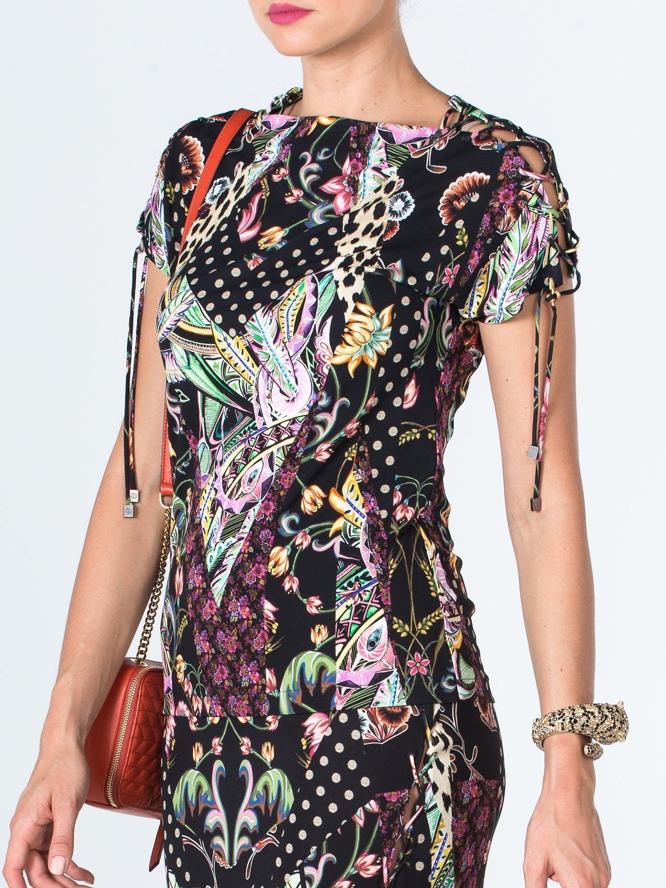Flowers in bloom, lace-up glam, and Roberto Cavalli's name: this top is a dream come true for anyone wanting to flaunt a chic and feminine style! A burst of vibrant floral print atop the delicate lace material creates a stunning effect that will turn heads wherever you go. The lace-up sleeves add tantalizing detail, making sure that you will look fabulous from every angle.