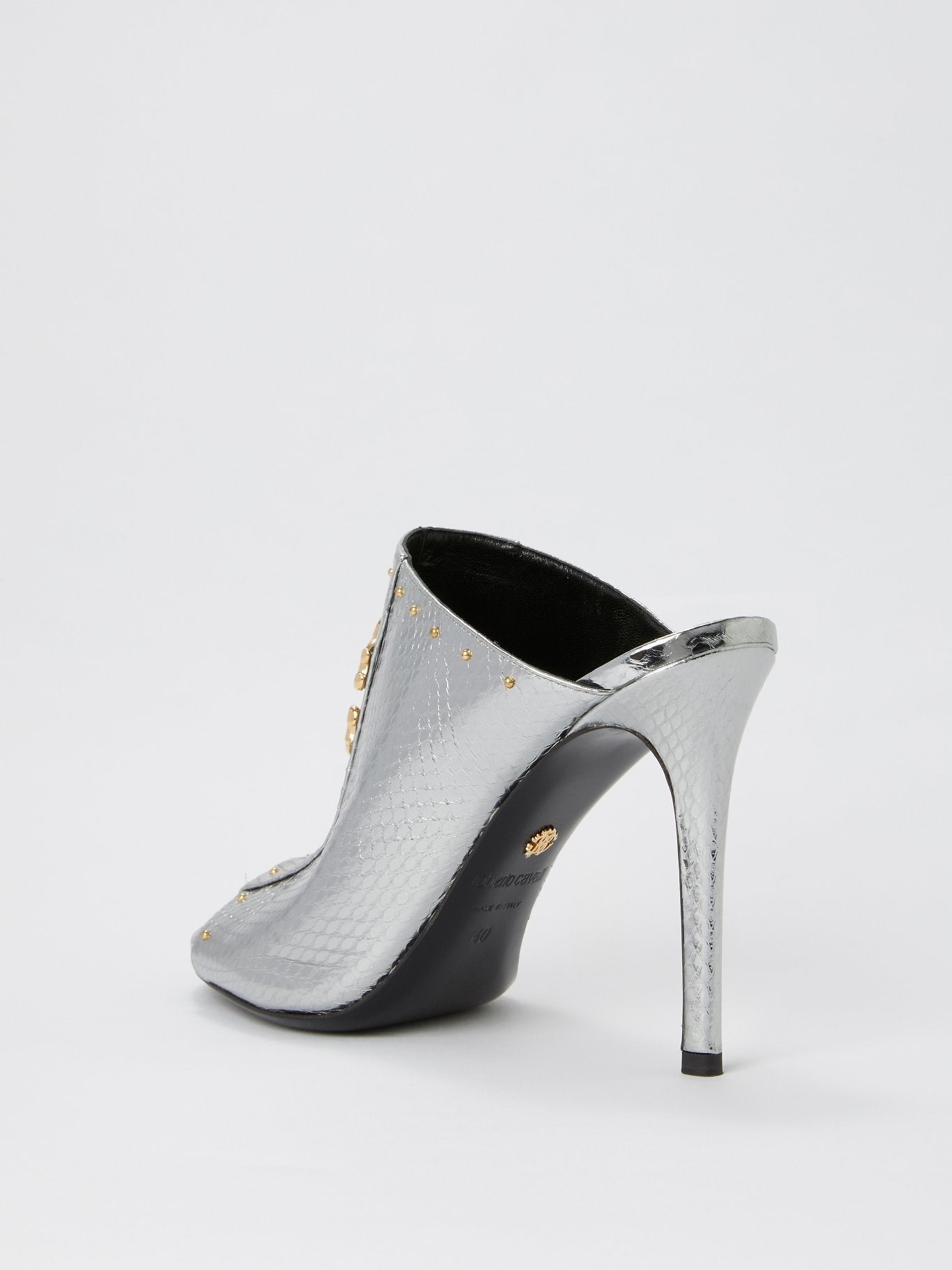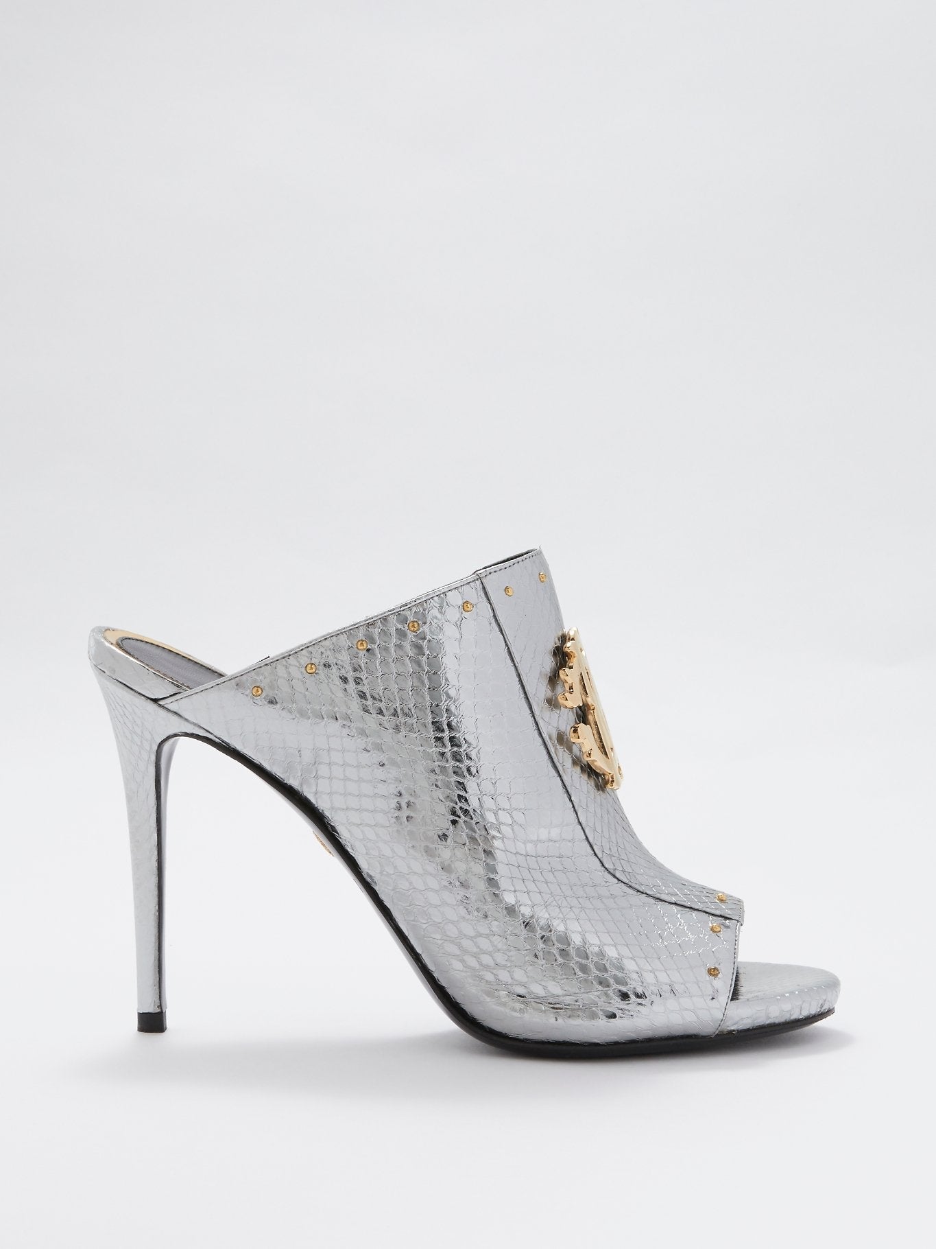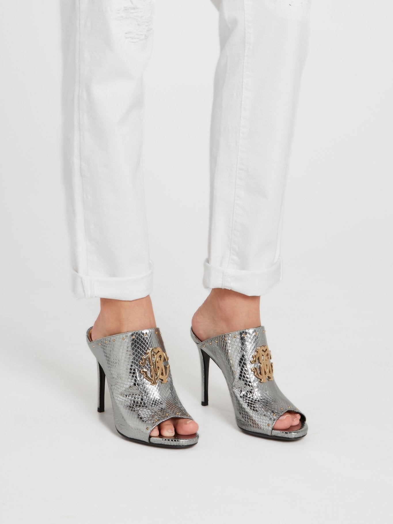 Step out in style this season with the Metallic Snake Effect Monogram Sandals by Roberto Cavalli. Featuring a sleek and stylish design, these sandals are perfect for any occasion. The metallic finish and snake effect make a bold fashion statement that will turn heads wherever you go!