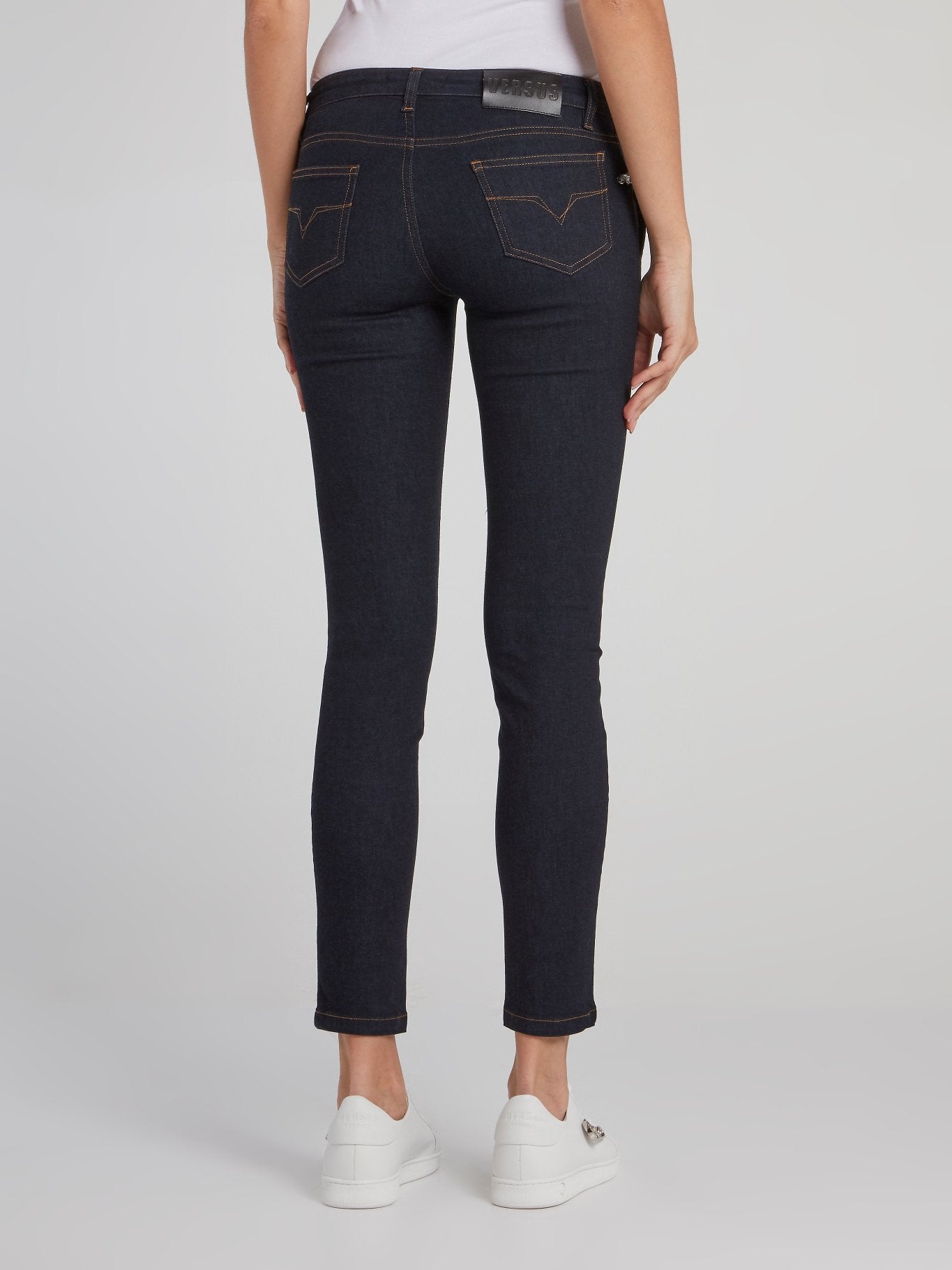 Step up your fashion game with the Navy Skinny Capri Jeans from Versus Versace. Made with premium quality cotton, these jeans offer a slimming effect and a comfortable fit that hugs your curves in all the right places. The navy blue color and capri length add a touch of understated elegance to your wardrobe, making these jeans perfect for any occasion.